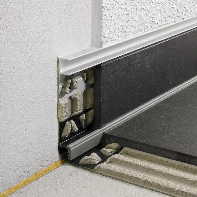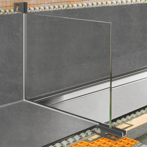 Profil ten wbudowany pomiędzy płytki na posadzce lub na ścianie jako profil szybowy nadaje się idealnie do zamontowania w nim elementów szklanych.